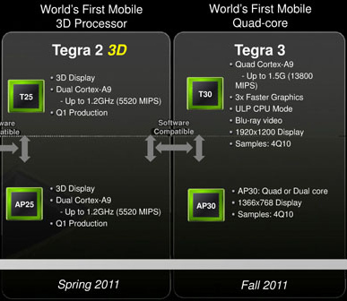 Spoločnosť Nvidia má pripravovať novú rýchlejšiu verziu svojho dvojjadrového ARM procesora Tegra 2 a nový štvorjadrový ARM procesor Tegra 3. Vyplýva to z uniknutých produktových plánov spoločnosti.