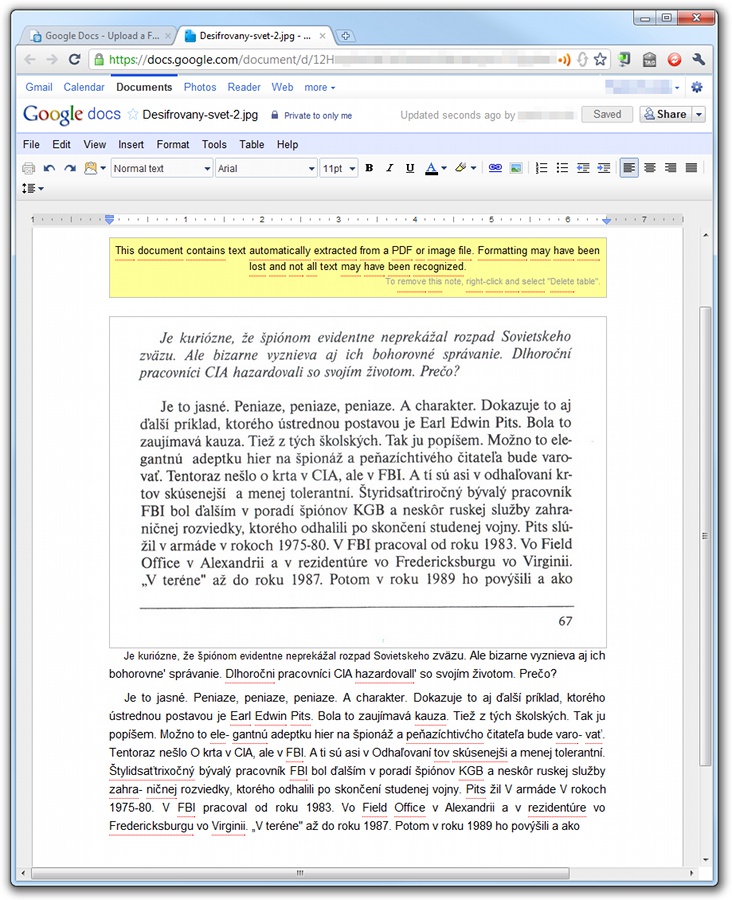 Google Docs podporuje OCR, Optical Character Recognition, od júna minulého roka pre päť svetových jazykov, angličtinu, španielčinu, nemčinu, taliančinu a francúzštinu.