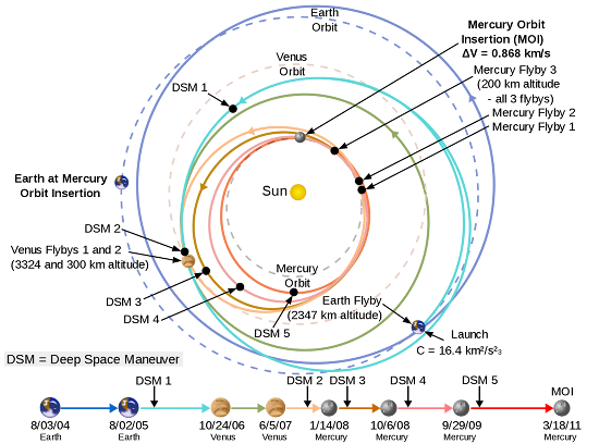 Sonda bola vypustená v auguste 2004, od vypustenia obiehala okolo Slnka a upravovala svoju trajektóriu na vhodnú pre vstúpenie na obežnú dráhu Merkúra. Počas svojho letu dvakrát preletela v blízkosti Venuše a trikrát okolo Merkúra, okrem finálneho priblíženia 18. marca.