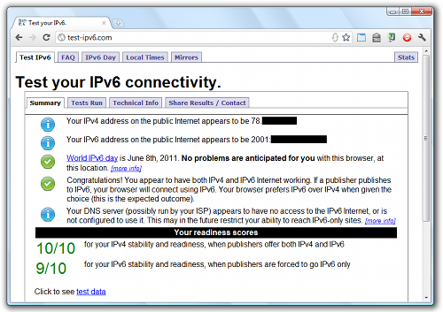 Hoci dnešný globálny test IPv6 je najmä testom poskytovateľov služieb a prevádzkovateľov infraštruktúry a pre absolútnu väčšinu užívateľov je transparentný, otestovať si fungovanie Internetu podporujúceho IPv4 a zároveň IPv6 samozrejme môžu aj koncoví užívatelia.