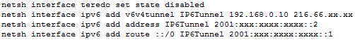 Príkazy pre nastavenie tunela od Hurricane Electric vo Windows Vista+, služba ich štandardne uvádza s vonkajšou IP namiesto lokálnej IP