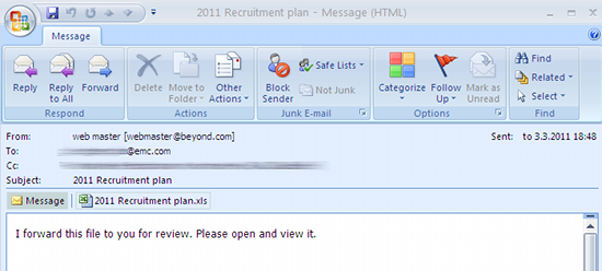 Email je datovaný na 3. marca, tváril sa ako email poslaný zo služby pre hľadanie zamestnancov Beyond.com a poslaný bol celkom štyrom zamestnancom RSA / EMC. Telo emailu obsahovalo jednoduchý text "I forward this file to you for review. Please open and view it."