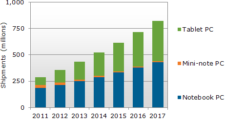 Počet predaných tabletov má podľa DisplaySearch výrazne rásť a v roku 2017 má dosiahnuť 383.3 milióna kusov. Notebookov sa má v roku 2017 predať 432 milióna.