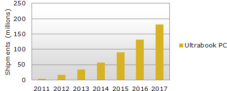 Spomedzi notebookov sa bude čoraz viac dariť ultrabookom, ktorých sa v roku 2017 predá takmer 180 miliónov. Neviem, ale najviac sa mi paci tato veta, pretoze nikdy sa to nenaplni podla ocakavani, a podla mna uz budu mat v rok 2017 noteboky aj v afrike, a urcite sa nebudu predavat ako teple rozky, ak to nebude mat 3D quad HD plazma LED ELCEDETEVE a pod... Len spochybnujem cisla.