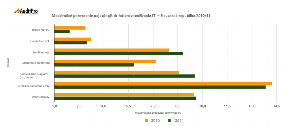 Zvýšila sa priemerná doba využívania sociálnych sietí, komunikačných IM programov a mierne online nakupovania. Naopak skrátila sa doba využívania PC na sťahovanie multimédií, hranie hier na PC a Internete a o niečo sa skrátila aj doba využívania emailu na súkromné účely. Tento ale zatiaľ stále jasne vedie s priemerne viac ako 13 minútami.