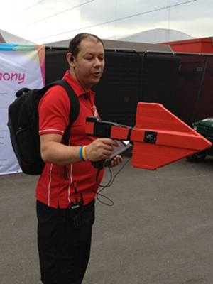 Fotografia zachytáva pracovníka podľa dostupných informácií so smerovou anténou R&S HE200, ktorá umožňuje hľadanie zdroja žiarenia na frekvenciách 20 MHz až 3000 MHz.