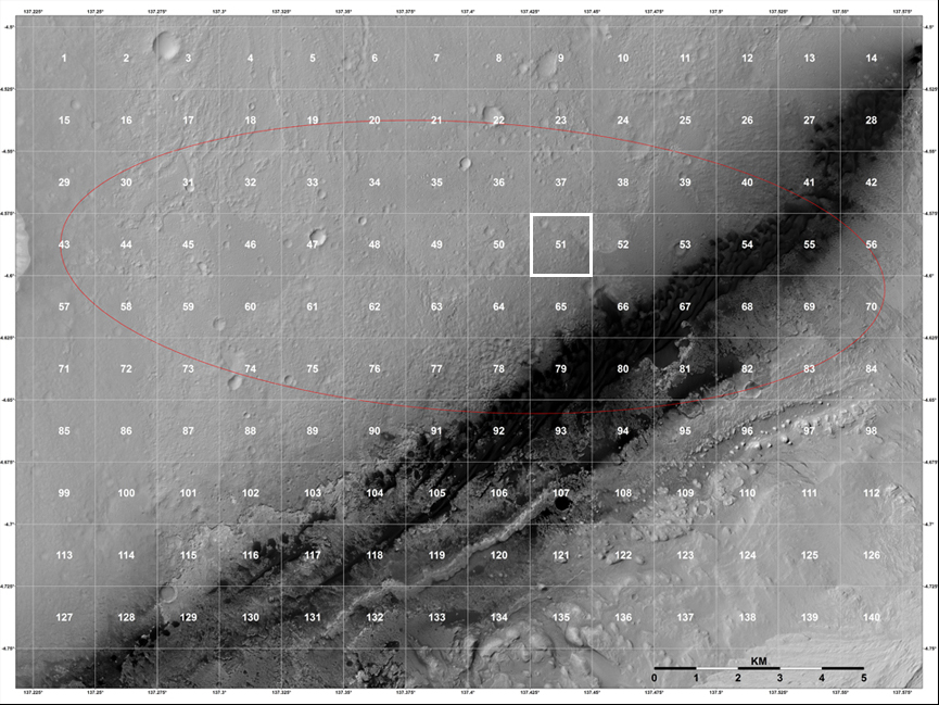 Pristávacia elipsa zasahuje do celkovo až 69 štvorcov, s akou pravdepodobnosťou malo Curiosity pristáť vo štvorci 51 podľa modelu známeho NASA pred pristátím nie je jasné.