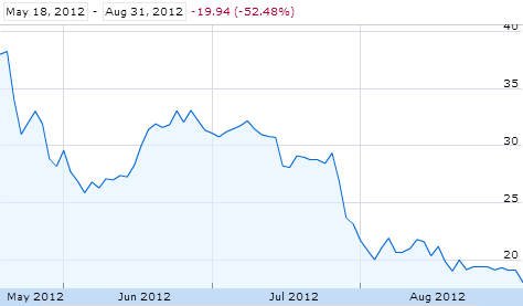 Noví investori, ktorí akcie Facebooku nakúpili v deň vstupu spoločnosti na burzu a akcie zatiaľ nepredali, tak prišli už o viac ako 50% ich hodnoty.