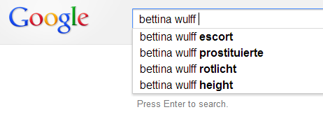 Google totiž po napísaní mena Wulffovej navrhuje vyhľadávanie výrazu pozostávajúceho z jej mena a napríklad výrazov v preklade znamenajúcich eskort, prostitútka a červené svetlo.