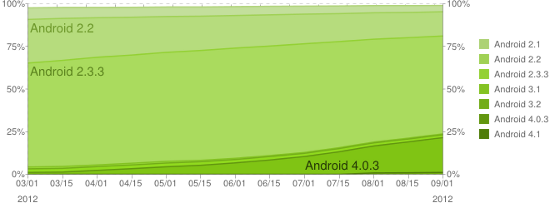 Podľa poslednej štatistiky Google za dvojtýždňové obdobie končiace sa 4. septembrom sa na Android zariadeniach konečne začala výraznejšie presadzovať verzia 4.0 tohto operačného systému.