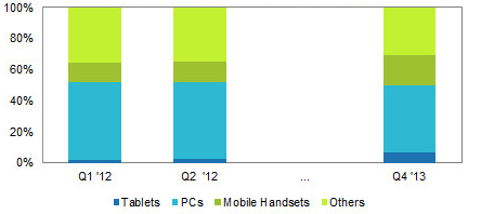 Kým v Q1 tohto roku podiel DRAM smerujúcej do tabletov predstavoval 1.6%, v Q2 to už bolo 2.7% a v Q4 2013 to má byť 6.9%. Podiel tabletov a všetkých mobilov dosahoval v Q1 14.1%, v poslednom štvrťroku budúceho roka to má byť 26.7%.