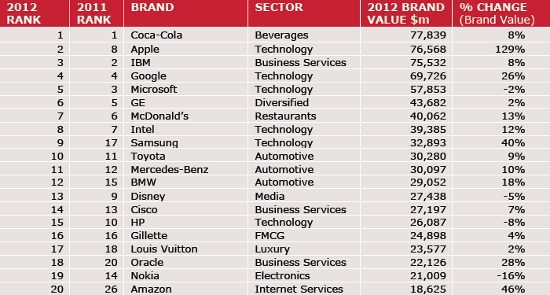 Na čele rebríčka s hodnotou 77.8 miliardy amerických dolárov je v tomto roku opäť Coca-Cola, na druhé miesto z ôsmeho skočila Apple so 76.6 miliardami.