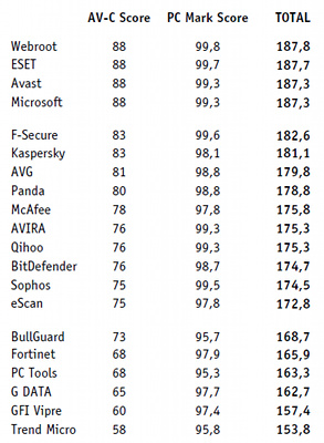 Skóre dosiahnuté v PC Mark bez antivírusu bolo považované za 100 bodov, počítač s inštalovaným antivírusom Webroot dosiahol pomerne 99.8 bodov, antivírusom Nod32 99.7 a F-Secure 99.6 bodov. Hranicu 99 bodov a teda zníženie výkonu o maximálne jedno percento dosiahli ešte Sophos s 99.5 bodmi a Avast, Avira, Microsoft Security Essentials a Qihoo s 99.3 bodmi.