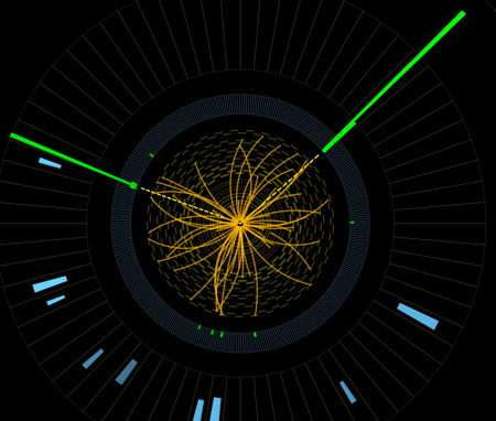 Stopy dvoch fotónov vzniknutých rozpadom Higgsovho bozónu detekovaných na LHC CMS (obrázok: CERN)