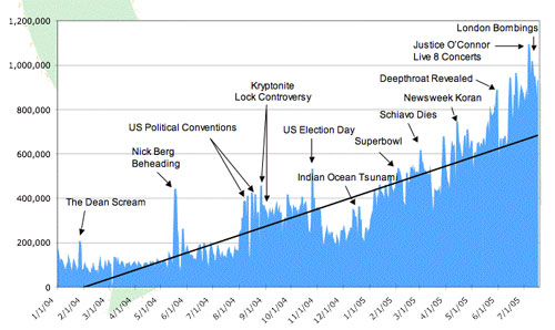 Veľmi zaujímavým je graf denného počtu príspevkov pre jednotlivé dni od januára 2004 po súčasnosť, kde je vidieť vplyv niektorých významných udalostí na počet príspevkov.