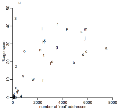 Podiel spamových emailových správ na všetkých prijímaných emailoch pre danú adresu závisí štatisticky na prvom písmene adresy, vyplýva z výsledkov novej štúdie vypracovanej Richardom Claytonom z Cambridgskej univerzity.