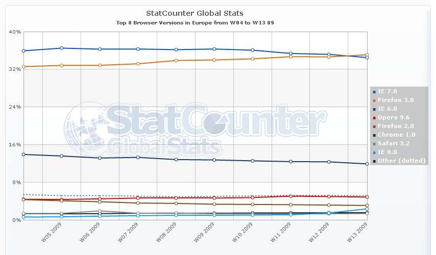 Novým najpoužívanejším prehliadačom sa v trinástom kalendárnom týždni v Európe stal Firefox 3.0. Tvrdí to spoločnosť StatCounter na základe monitorovaných štatistík návštevnosti webových stránok.