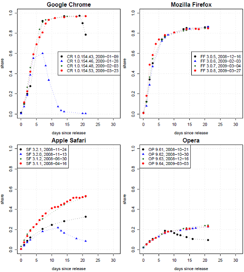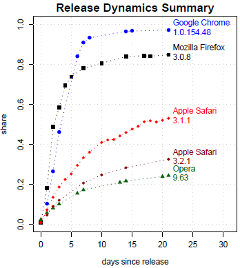 U Chrome, Firefoxu aj Opery s výnimkou nových verzií, ktoré boli po niekoľkých dňoch nahradené ďalšou novou verziou, je rýchlosť aktualizácie u všetkých verzií z posledného obdobia prakticky rovnaká. U Safari bola vzhľadom na rozličné spôsoby aktualizovania rýchlosť rozdielna u verzií 3.1.x a 3.2.x.