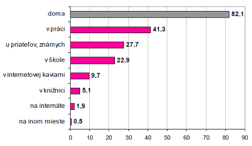 Z užívateľov Internetu, ktorí ho využili minimálne raz v poslednom mesiaci pred prieskumom, ho doma využíva teda 82.1%. V práci je to 41.3%, u priateľov a známych 27.7%, v škole 22.9%, internetovej kaviarni 9.7%, v knižnici 5.1%, na internáte 1.9% a na inom mieste 0.5%. Respondenti mohli uviesť samozrejme viac typov lokalít, kde Internet využívajú.