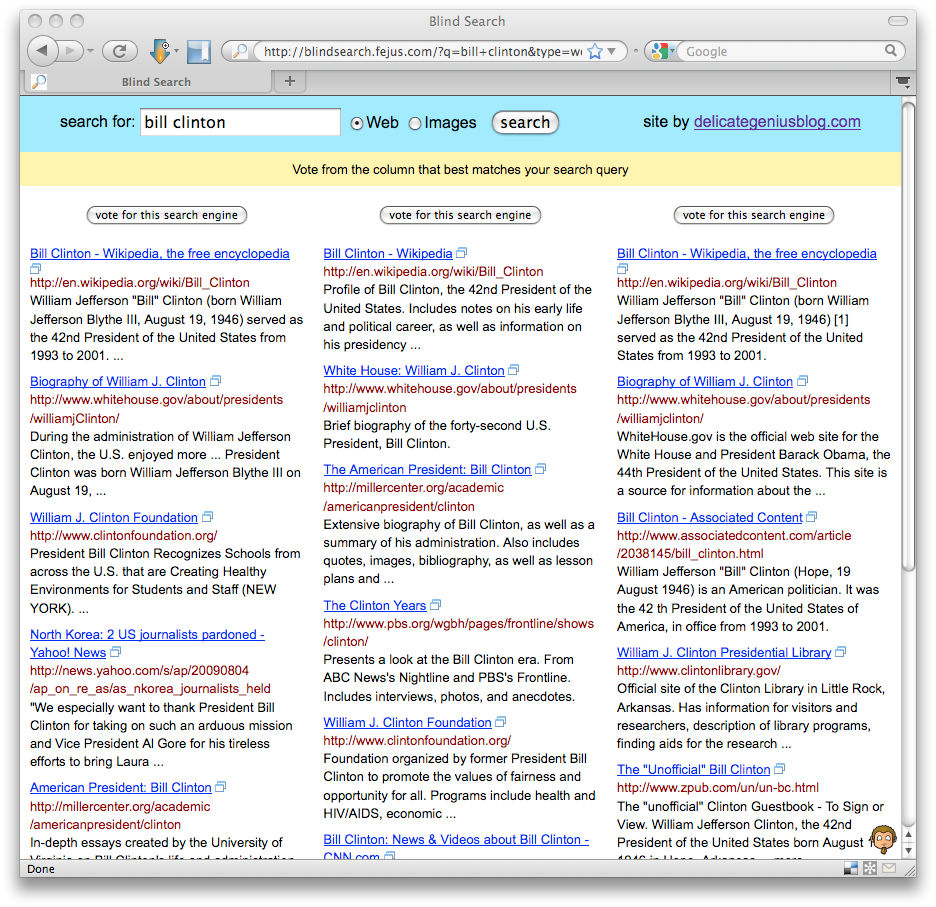 Služba BlindSearch spustená v júni umožňuje užívateľom posúdiť kvalitu nájdených výsledkov pre rovnaké vyhľadávanie tromi globálne vedúcimi vyhľadávačmi, Google, Yahoo a Bing. Výsledky sa nachádzajú v troch stĺpcoch, vyhľadávače sú zoradené náhodne a výsledky nie sú označené.
