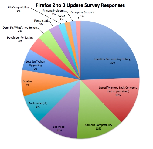 Výsledky boli zozbierané v máji od užívateľov, ktorým bol automaticky vo Firefoxe 2.0 ponúknutý upgrade na verziu 3.0, nevyužili ho a vyplnili formulár o dôvodoch, pre ktoré nechcú upgradovať.