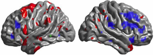 Miesta zhrubnutia kôry (červenou) a zvýšenia efektivity (modrou), na ľavej strane ľavá a na pravej pravá hemisféra (ilustrácia: Mind Research Network)