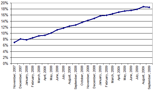 Kým v auguste používalo Windows Vista 18.8% návštevníkov webových stránok, v septembri to bolo 18.62%. Medzimesačne pritom podľa štatistík Net Applications podiel Windows Vista nepretržite rástol od januára 2008, kedy mal podiel 7.83%.