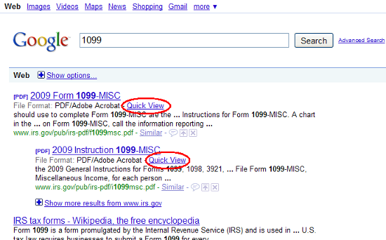 Pri PDF výsledkoch vyhľadávania sa začali objavovať odkazy Quick View v anglickej verzii a Zobraziť v slovenskej verzii, ktoré PDF otvoria pomocou Google Docs prehliadača PDF. Otvoriť prehliadač PDF je možné samozrejme rovnako ako samotné výsledky v novom tabe.