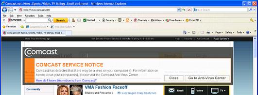 V pop-upe je možné nájsť odkaz na antivírusové centrum Comcastu, kde je okrem inštrukcií k dispozícii zdarma na stiahnutie Comcastom dotovaný komerčný antivírus.