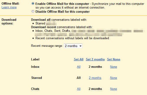 Aktivovať podporu pre offline prístup k Gmailu je možné v nastavení experimentálnych rozšírení Labs, vyžadovaný je prehliadač s inštalovanou technológiou Google Gears.