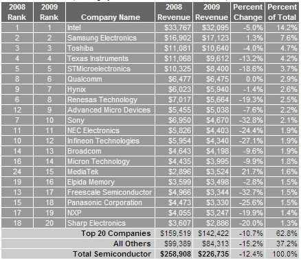 Celkovo príjmy dodávateľov čipov v roku 2009 dosiahnu podľa iSuppli 226.74 miliardy dolárov, čo bude znamenať pokles o 12.4% oproti minulému roku.