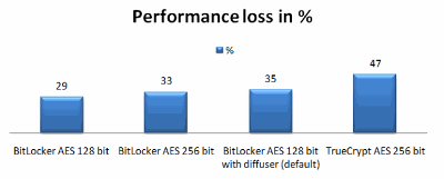 Pri použití BitLockera s AES s 256-bitovým kľúčom prišlo k spomaleniu o 33%, v prípade TrueCrypt s rovnakým algoritmom k spomaleniu o 47%.