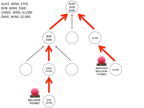 MIT v prípade svojho víťazstva prisľúbil každému, kto objaví balón a nahlási jeho presnú polohu, 2000 dolárov. 1000 dolárov dostal ten, kto daného užívateľa motivoval na účasť v MIT tíme, 500 dolárov ten, kto motivoval tohto užívateľa, atď. Na každý balón sa tak prerozdelilo maximálne 4000 dolárov, ich nevyčerpaná časť išla na charitu.
