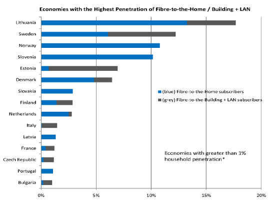 Najväčšiu penetráciu má podľa FTTH Council Europe Litva s 18% domácností s optickou prípojkou, väčšinou typu FTTH.
