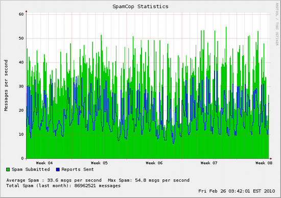 Úroveň hláseného spamu za posledný mesiac (graf: SpamCop)
