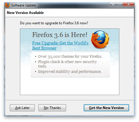 Spoločnosť Mozilla vo štvrtok upozornila na spustenie procesu aktualizácie starších podporovaných verzií Firefoxu, verzií 3.0 a 3.5, na novú verziu 3.6.