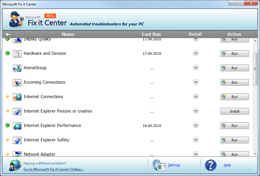 Nástroj nadväzuje na samostatné špecifické spustiteľné Fix it riešenia určené pre individuálne konkrétne problémy s konfiguráciou alebo bezpečnosťou vo Windows.