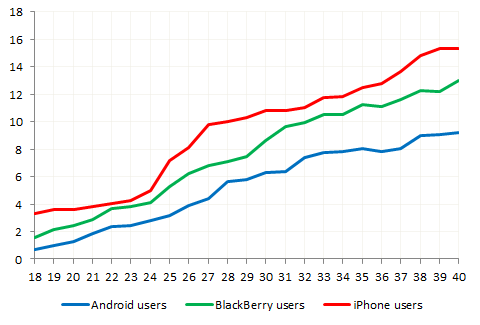 priemerný užívateľ iPhone má do 40ky iba 15 žien? tak to ja by som mal mať so svojim priemerom už 80 rokov. Možno je to tým že mám Sony Ericsson a Nokiu.
