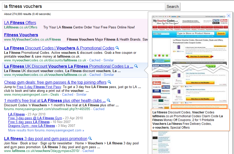 Google pri výsledku vyhľadávania zobrazuje veľký náhľad danej stránky, ktorý podľa dostupných screenshotov zachytáva výrazne väčšiu vertikálnu časť stránky ako pri jej bežnom zobrazení v prehliadači pri bežných rozlíšeniach.
