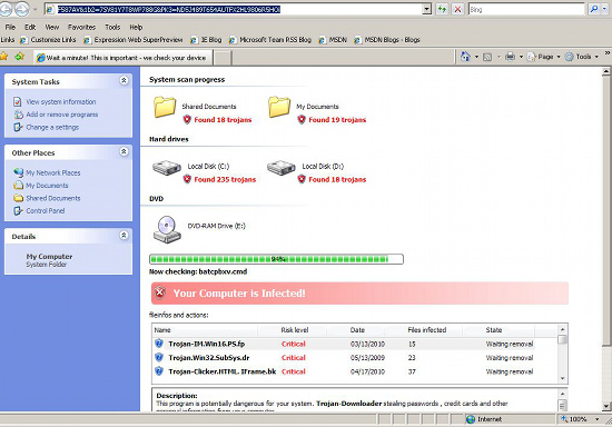 Užívateľ bol po kliknutí na odkaz na stiahnutie Kaspersky Internet Security presmerovaný na stránku, ktorá falošne informovala o nájdení škodlivého softvéru, trojanov, na užívateľovom PC a ponúkala na stiahnutie falošný antivírus. Antivírus bol označený ako Security Tool.