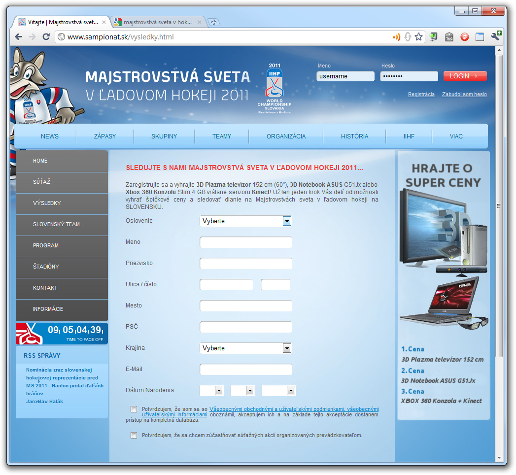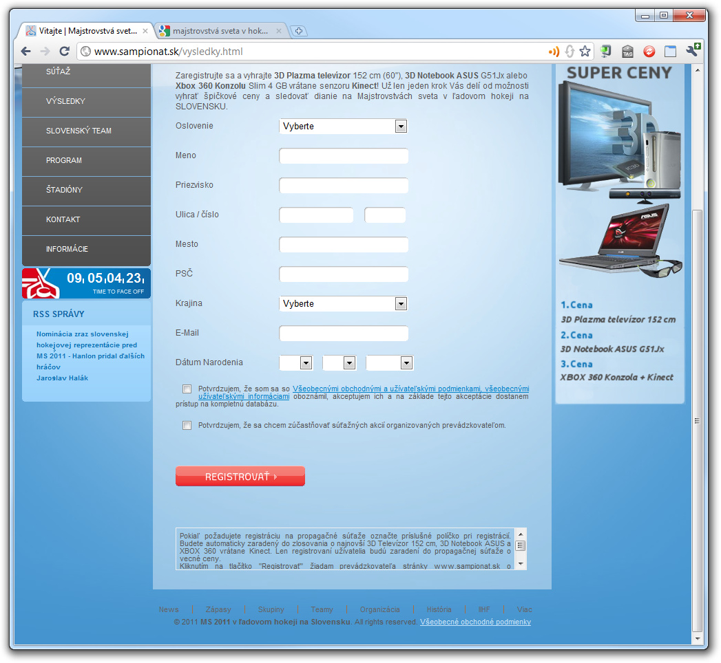 Redakcia: tato stranka nie je z tych 60-eurovych, ale 50-eurovych (podobne ako stranka futbalovych majstrovstiev 2010 JAR, www.ms-2010.sk). Nakoniec suma je uvedena aj vo VOP aj v texte, ktory treba scroolovat pod registraciou...
