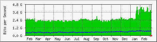 Oproti začiatku januára, kedy SIX prvýkrát prekonal 50 Gbps, prišlo v dátovej prevádzke jednotlivých prípojok tiež k jednej významnej zmene, výraznému skokovému zvýšeniu vyťaženia pripojenia DataCamp. Kým približne do polovice januára dosahovali denné priemery okolo 2.5 Gbps, aktuálne denné priemery sú na úrovni 4.5 Gbps a maximá prekračujú 6.0 Gbps.