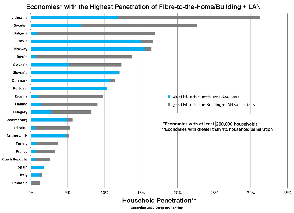 Vyplýva to zo štatistiky, ktorú na aktuálne prebiehajúcej konferencii FTTH Conference 2013 zverejnila organizácia FTTH Council Europe. Štatistiku vypracovala spoločnosť IDATE.