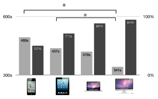 "Subjekty s menšími zariadeniami išli hľadať dozor v menšom percente prípadov a oveľa neskôr ako subjekty s väčšími zariadeniami. Konkrétne 50% subjektov, ktorí v teste používali iPod touch, išlo vyhľadať dozor pred uplynutím desiatich minút a spravili tak priemerne po 8 minútach a 13 sekundách. Z používateľov iMacu išlo hľadať dozor 94% subjektov a to priemerne už po 5 minútach a 41 sekundách."