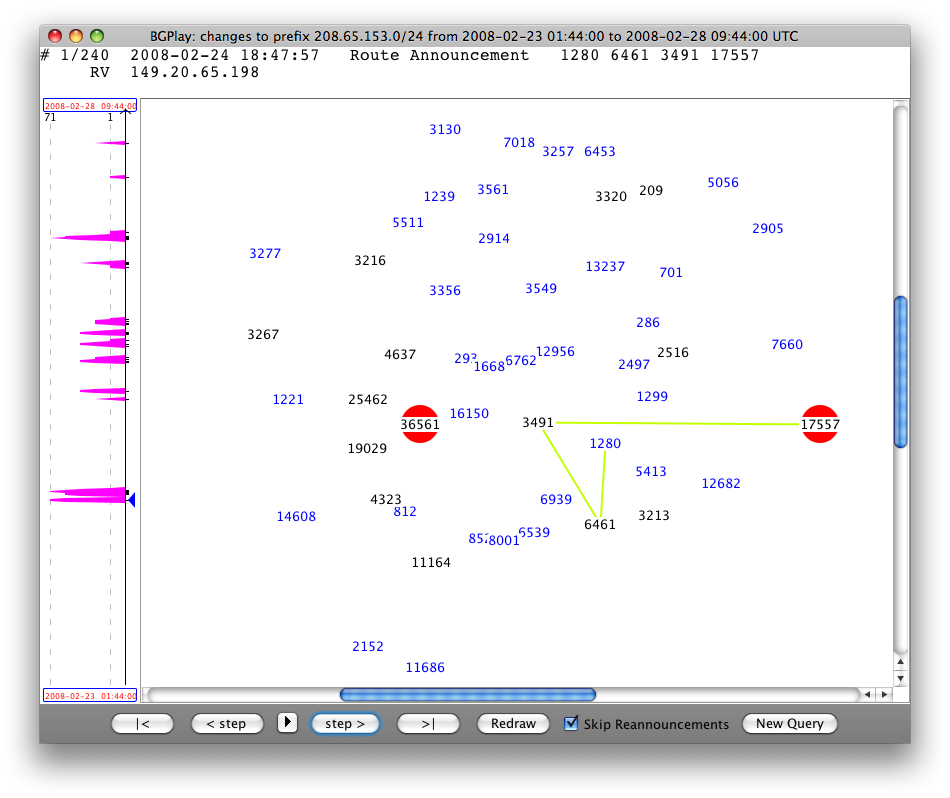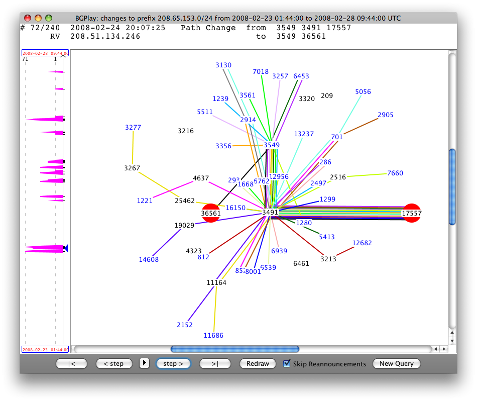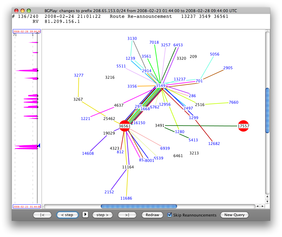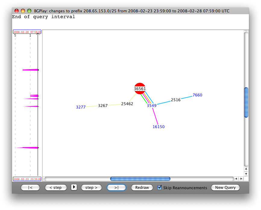 Začiatok propagovania 208.65.153.0/24 o 19:47:57 (BGPlay časy uvádza v GMT) a globálne presmerovanie o 19:49:21. Pred 19:47:57 bolo na AS36561 smerované routovanie väčšieho rozsahu 208.65.152.0/22, na grafe BGPlay, ktorý vizualizuje iba zmeny, ale nie je znázornené.