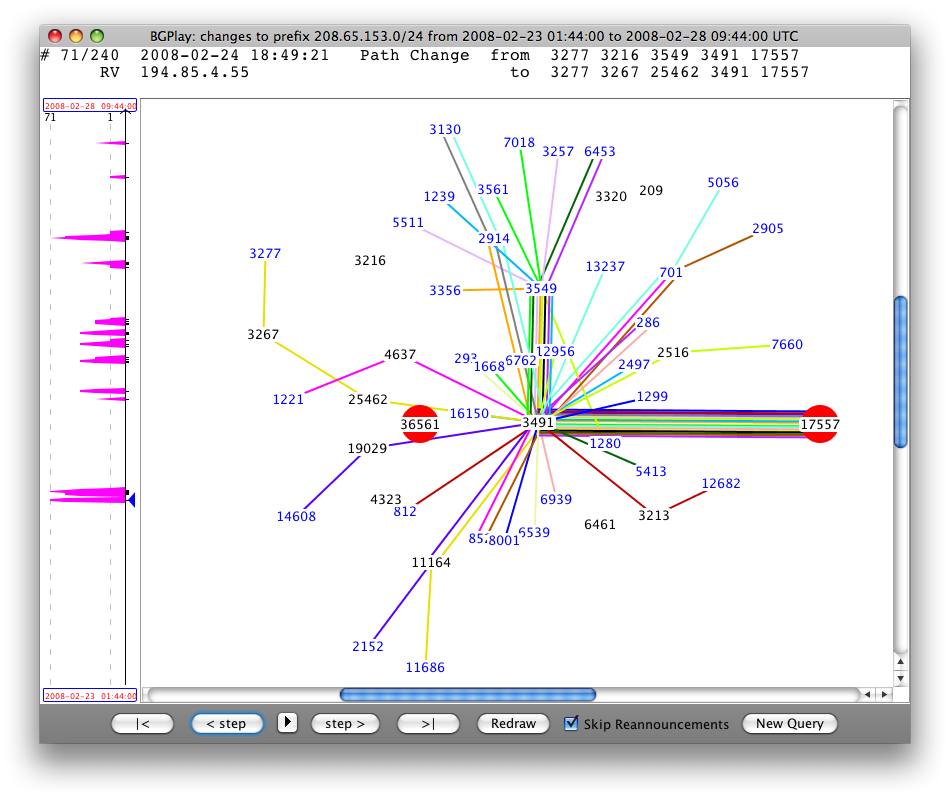 Prehrať si priebeh získania kontroly Pakistan Telecomom nad IP rozsahom 208.65.153.0/24 je možné pomocou Java appletu BGPlay na stránkach Router Views tu.