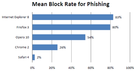 Internet Explorer 8 priemerne blokoval 83% z testovaných phishingových stránok, Firefox 3 80%. Tieto dva prehliadače viedli aj v rýchlosti blokovania, keď IE 8 blokoval nové phishingové stránky priemerne po 4.9 hodinách od ich zaradenia do testovacej databázy a Firefox 3 po 5.2 hodinách.