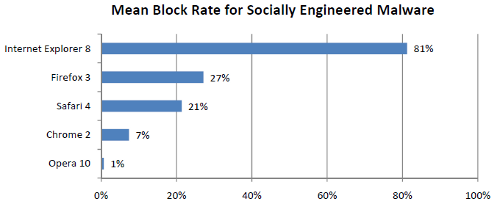 IE 8 dokáže údajne blokovať 81% takýchto URL, druhý Firefox 3 len 27%. Firefox 3.5 nezahrnutý do testu podľa autorov v tomto teste dosahuje rovnaké výsledky ako verzia 3.0.